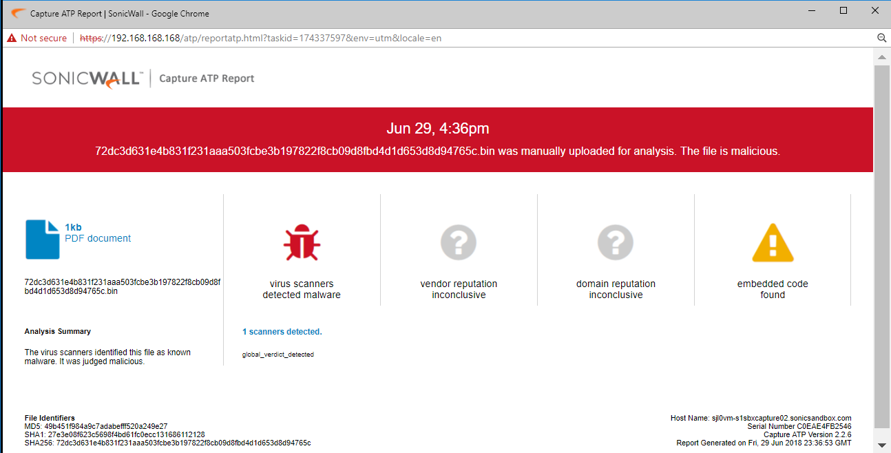 SonicWALL Capture ATP (Advanced Threat Protection), a cloud-based multi-engine dynamic sandbox analysis provides protection against this attack